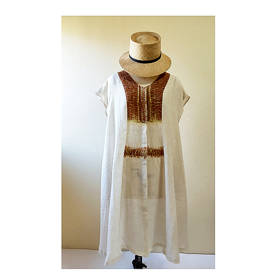 リネン手絞りワンピース~フレンチスリーブの前開き比翼仕立て
