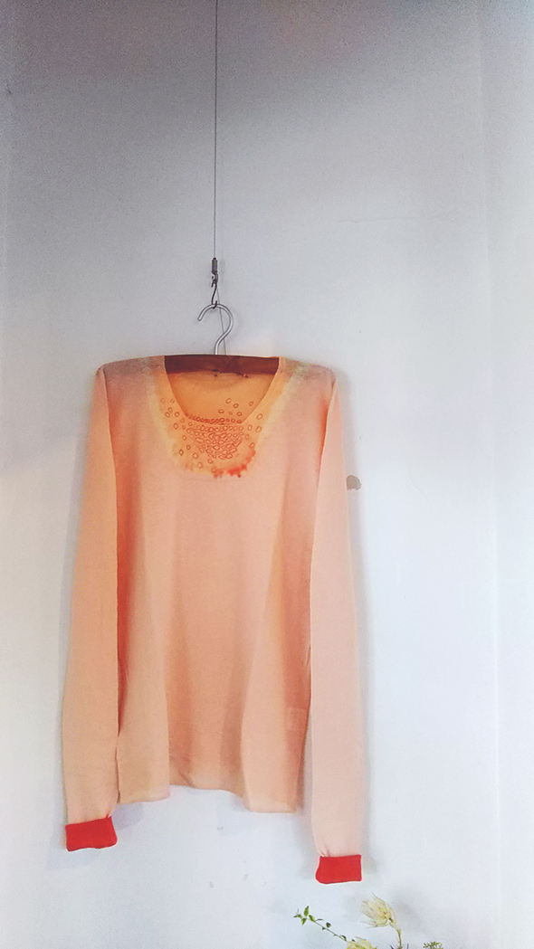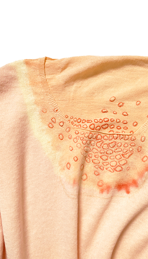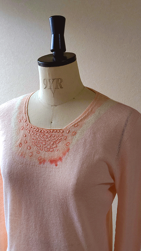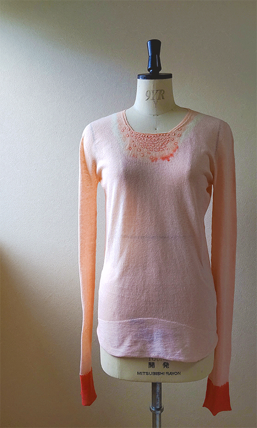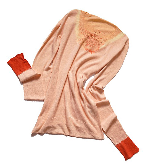 襟元に小さなドットの集合体をデザインした手染めニットです。手絞り後、リップル加工でドット模様が少し盛り上がって立体的になっています。襟元と袖口のキャロットレッドの配色がデザインアクセント。 メインカラーのライトピンクとの濃淡使いで品良く仕上がりました。