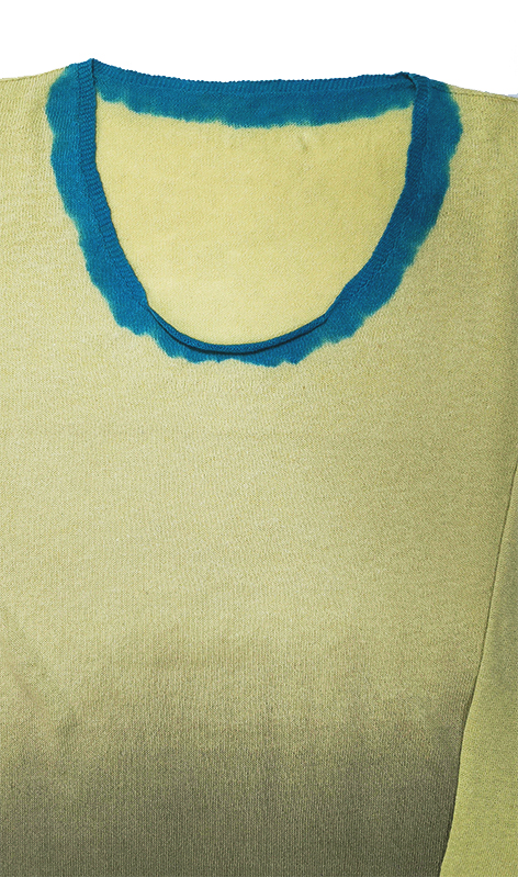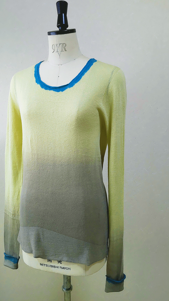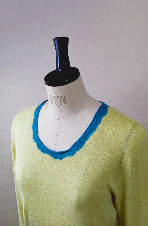 丁寧に手染したグレーのグラデーションと襟もとと袖口にブルーを効かせた配色がデザインポイント。 メインのライトグリーンとのコントラストが楽しい一枚になりました。夏は一枚でインナーとして、またシャツをインして襟を見せる着こなしも可能なサイズ感にしています
