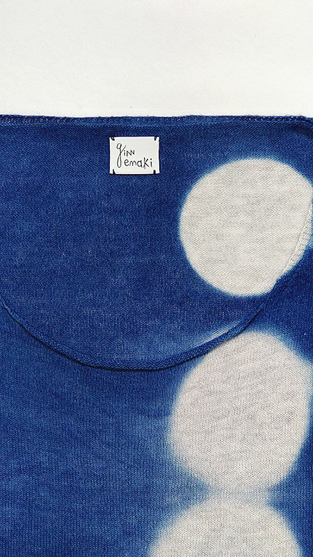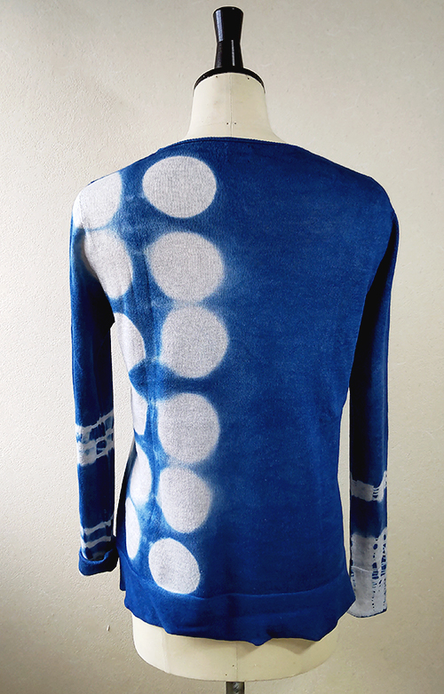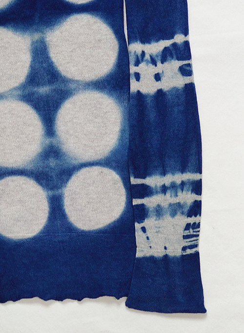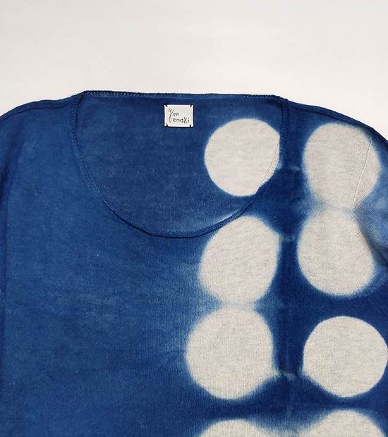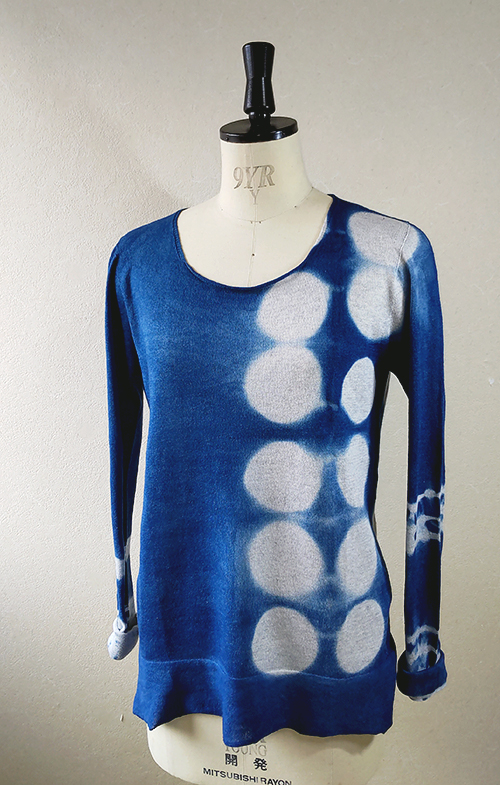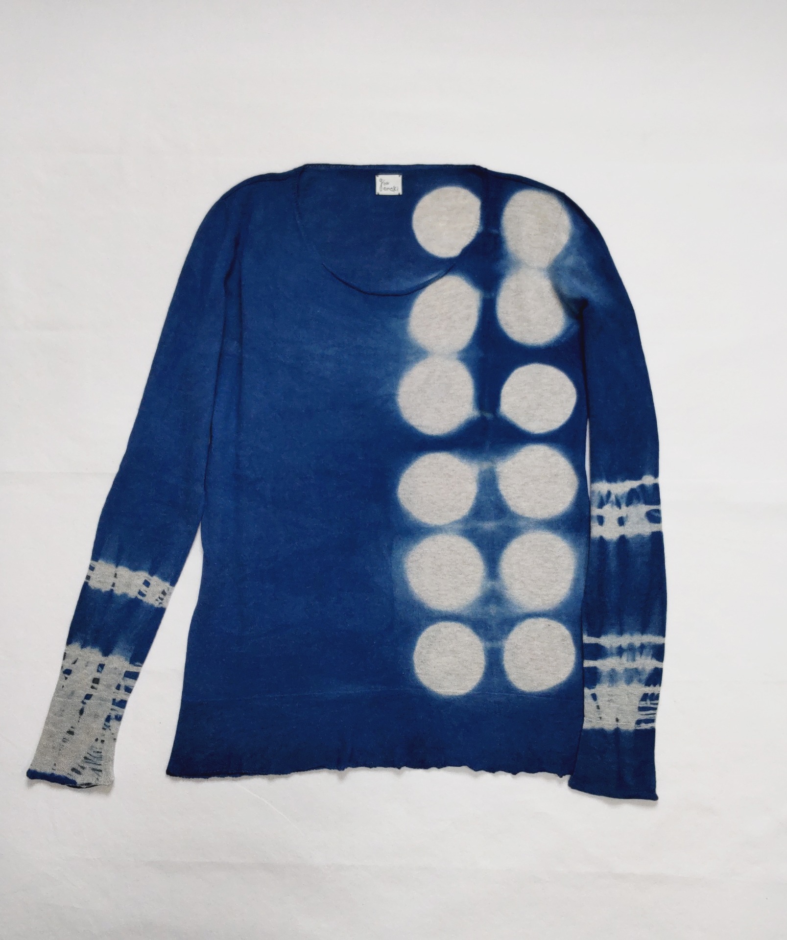 ライト杢グレーのニット生地に丸い板を当てて手染めしています。前身頃の半分(後ろも)に丸い模様を並べたリズム感のあるデザインです。こちらの商品はインド藍で染め上げています。明るいブルーが映える一枚です