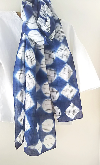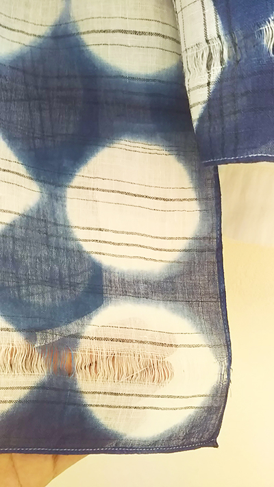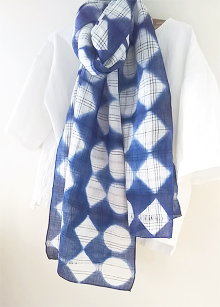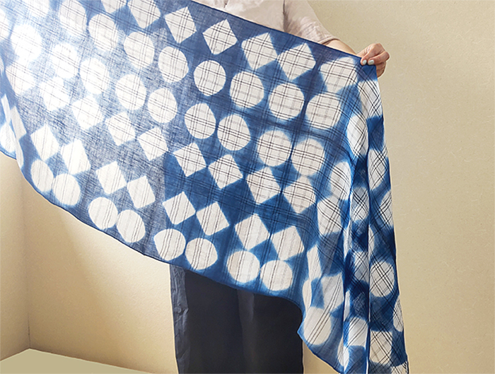 麻の中でも質の良いラミー糸を使って、細い線を組み合わせて描いた繊細な生地に、マルとシカクの板を当てて藍で手染めしています。(有松鳴海絞の”板締め”という技法を用いています)