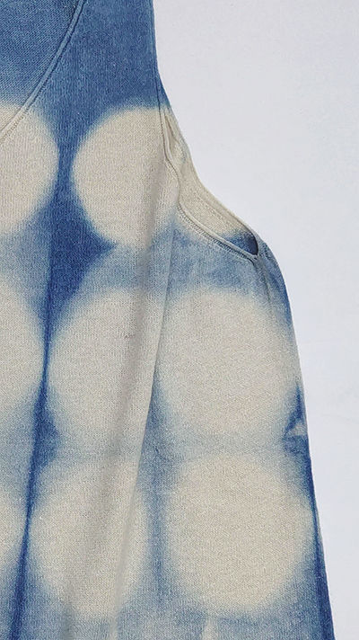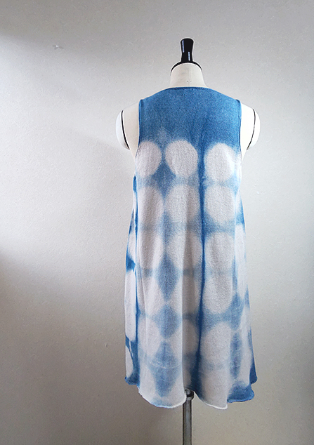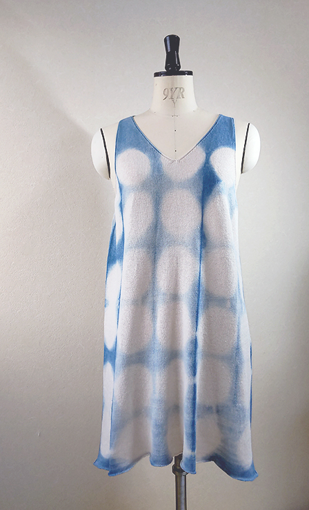 柔らかい生成りのコットン素材に丸型の板を当ててインド藍で染めたニットワンピースです