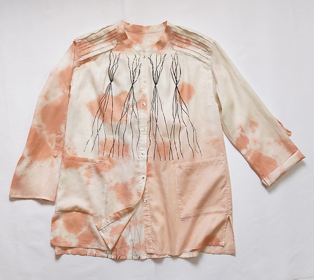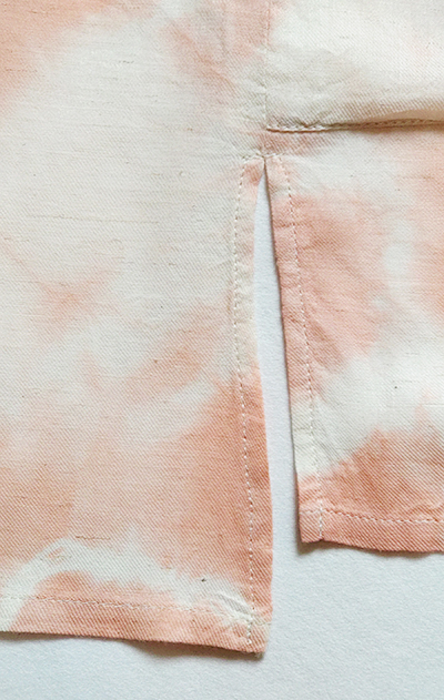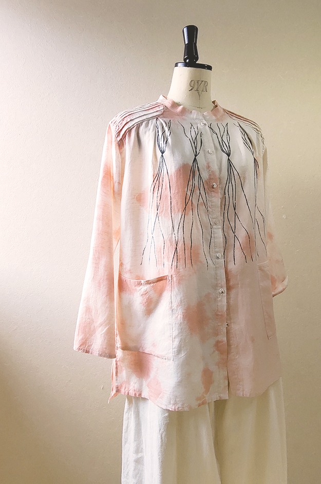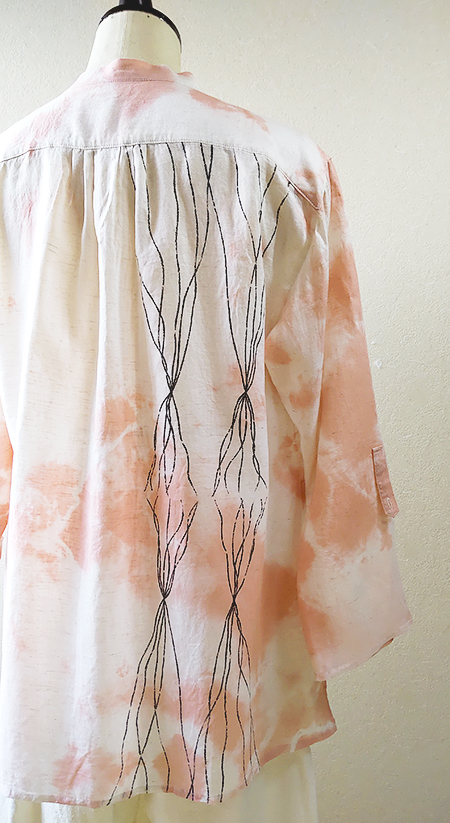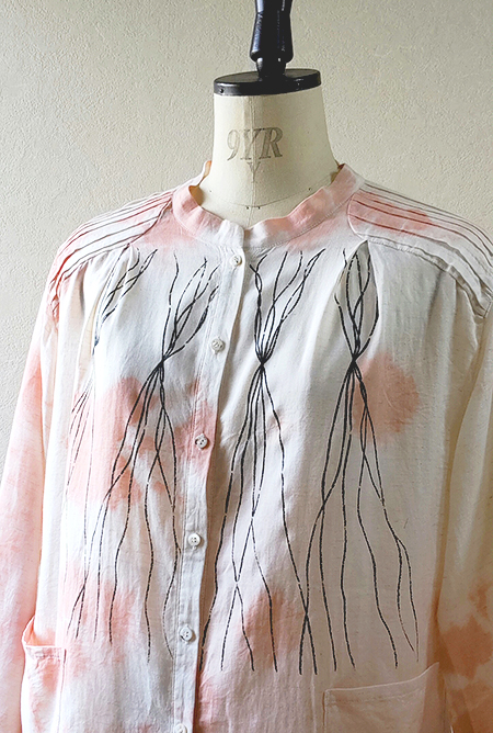 ふんわり軽く透け感のある生地に、プリミティブな線を描いてプリントした後、淡いピンクでちょっぴり”攻め”を感じる絞りを施しました。肩にピンタックのヨークとポケットをデザインアクセントにしています