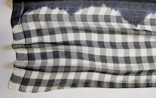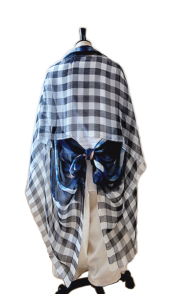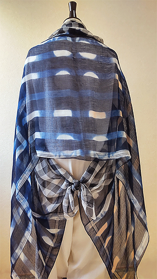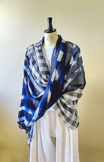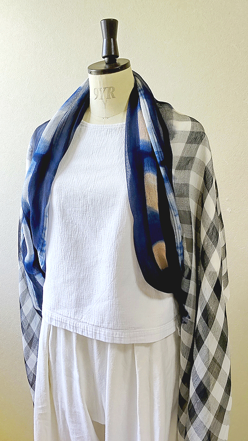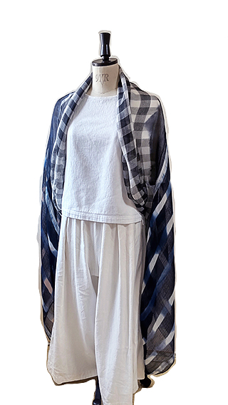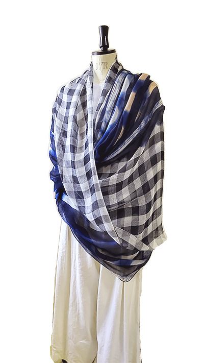ふんわり柔らかいコットンとシルクを少し使ったガーゼ素材に、先染めギンガムチェックと手染め(藍染め)を施したビッグサイズストールです