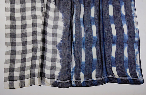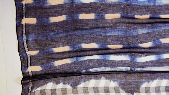 軽くて透け感のある繊細なガーゼ生地に、淡いカラーで一度染めた後、濃い藍色で手染めしていますので模様が立体的に見えます